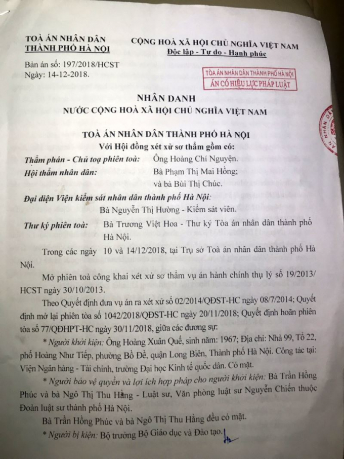 | Toà án Nhân dân cấp cao không chấp nhận việc kháng cáo quá thời hạn của Bộ trưởng giáo dục. Bản án sơ thẩm số 197/2018/HCTS ngày 14.12.2018 của Tòa án nhân dân Thành phố Hà Nội có hiệu lực ngay lập tức. |
