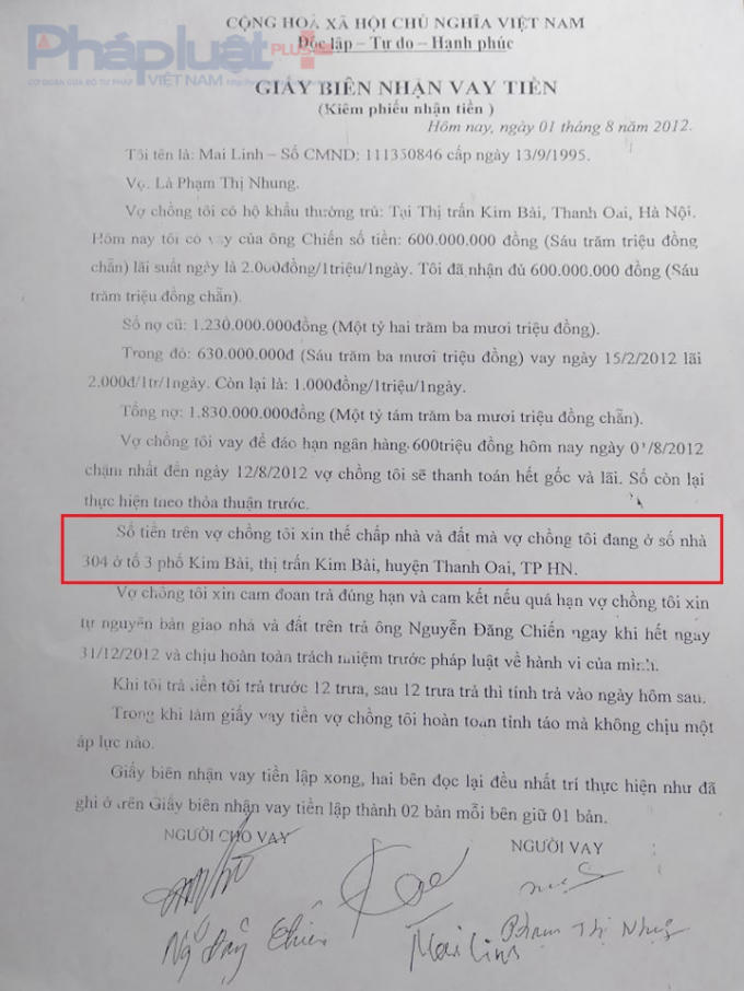 Giấy biên nhận vay tiền giữa ông Chiến và vợ chồng ông Mai Linh. Hai bên viết giấy vay tiền thể hiện rất rõ việc thế chấp tài sản nhà và đất (ghi trong ô đỏ) của vợ chồng ông Mai Linh, bà Nhung nếu không trả được nợ.