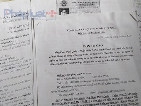 Trước đó, như đã đưa tin, ông Nguyễn Đăng Chiến (SN 1965, trú tại phố Kim Bài, thị trấn Kim Bài, huyện Thanh Oai, TP Hà Nội) gửi đơn đến Tòa soạn Pháp luật Plus (Báo Pháp luật Việt Nam) và cơ quan chức năng với nội dung: Tố cáo đích danh ông Phan Quốc Quân - Thẩm phán TAND huyện Thanh Oai, TP Hà Nội vì cố tình không áp dụng biện pháp khẩn cấp tạm thời, phong tỏa tài sản của người có nghĩa vụ theo yêu cầu của đương sự để bảo đảm cho việc thi hành án sau này...