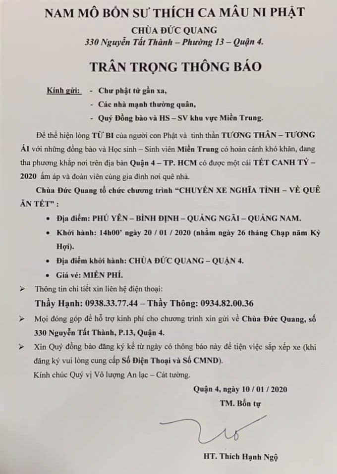 Được biết, hiện tại chùa Đức Quang (Q.4, TP.HCM) đang thực hiện chương trình “Chuyến xe nghĩa tình - Về quê ăn Tết” cho học sinh - sinh viên ở các tỉnh miền Trung có hoàn cảnh khó khăn.