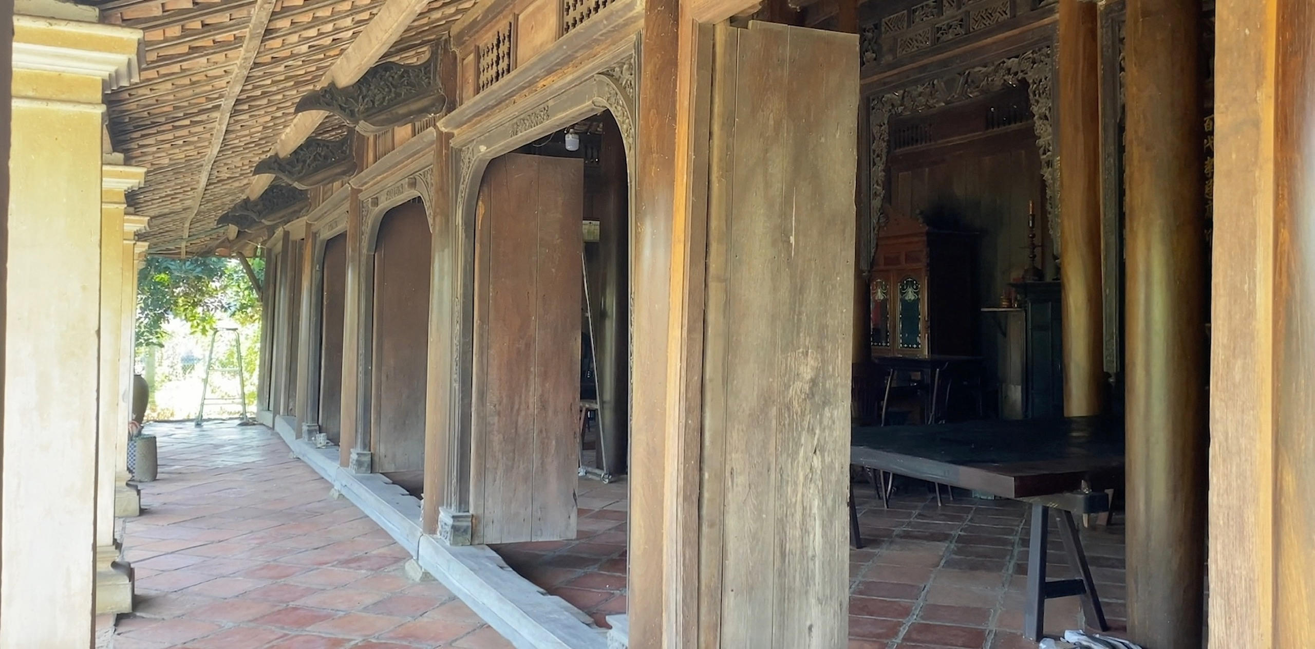 Toàn bộ kết cấu ngôi nhà đều bằng gỗ, với nhiều loại gỗ quý, mái lợp ngói âm dương, nền lát gạch tàu đỏ.
