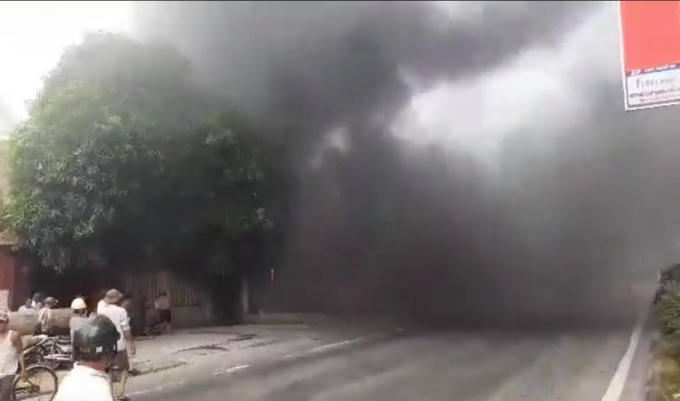 Khói đen từ vụ cháy phủ kín quốc lộ 1A.