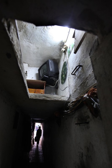 Trái với vẻ ngoài hào nhoáng, sầm uất ở mặt tiền phố cổ, sâu trong con ngõ 44 Hàng Buồm là những căn nhà vỏn vẻn trên dưới 10m2. Bước chân vào ngõ, nơi đây như biến thành một căn hầm thực sự.