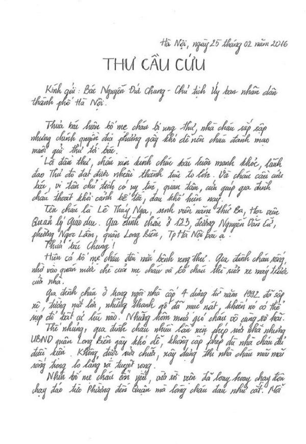 Trong bức thư viết tay gửi Chủ tịch UBND TP Hà Nội ông Nguyễn Đức Chung, Nga đã nói rõ về hoàn cảnh gia đình, quyền sử dụng đất và việc gây khó khăn của chính quyền địa phương.