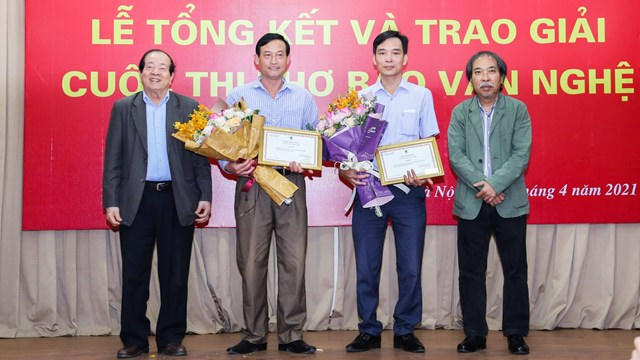 Chủ tịch và nguyên Chủ tịch Hội Nhà văn Việt Nam trao giải B cho hai tác giả đoạt giải B.