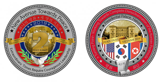 Mặt còn lại của đồng xu có dòng chữ "Bước ngoặt - hợp tác hướng tới phi hạt nhân hóa hoàn toàn bán đảo Triều Tiên" kèm hình ảnh Phủ Chủ tịch ở Hà Nội cùng quốc kỳ của ba nước Mỹ, Hàn Quốc và Triều Tiên. Ngoài ra, đồng xu còn có dòng chữ “Đàm phán hòa bình, Việt Nam, 2019”.