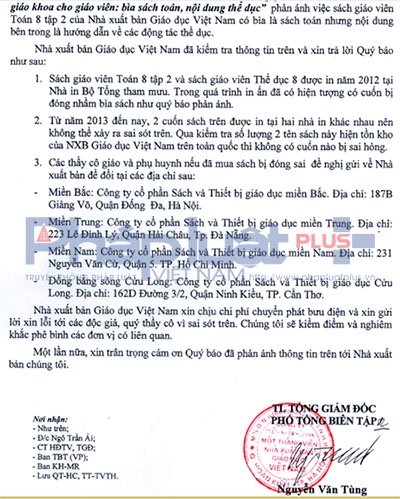 Trước sự việc trên, ngày 31/12, NXB Giáo dục Việt Nam đã trả lời Phapluatplus bằng văn bản.