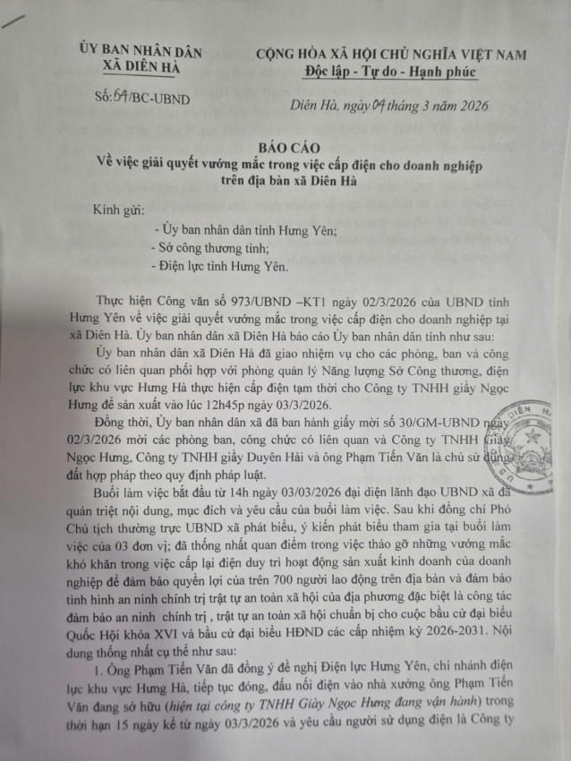 Trước những vướng mắc nêu trên, ngày 4/3/2026, UBND xã Diên Hà đã có báo cáo gửi UBND tỉnh Hưng Yên, Sở Công thương tỉnh Hưng Yên và Điện lực tỉnh Hưng Yên đề nghị xem xét giải quyết việc cấp điện cho nhà xưởng nơi Công ty Giày Ngọc Hưng đang sản xuất.