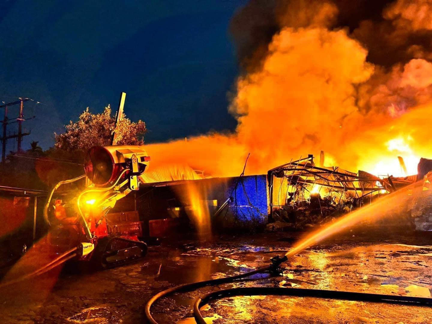Đêm ngày 22/2, ngọn lửa bùng phát tại nhà xưởng, khói đen bóc cao lên bầu trời.