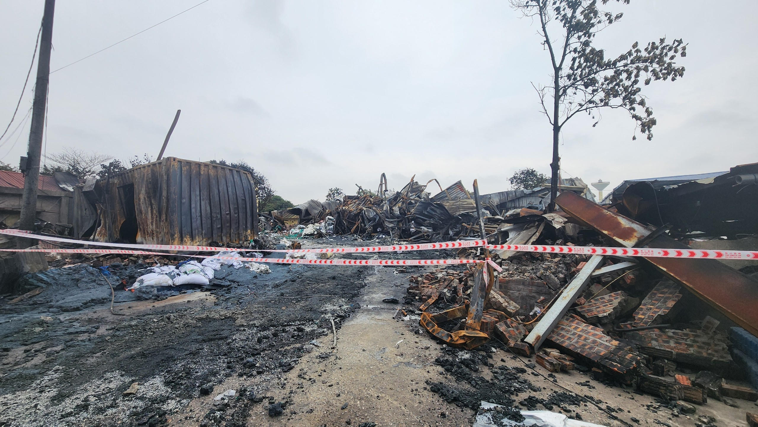 Hầu như toàn bộ nhà xưởng rộng hơn 500m2 bị ngọn lửa thiêu rụi sau vụ cháy.