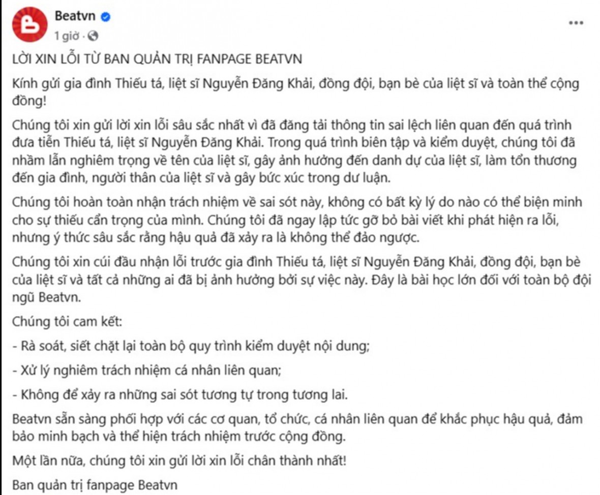 Theo nội dung bài viết, Beatvn gửi lời xin lỗi sâu sắc nhất vì đã đăng tải thông tin sai lệch liên quan đến quá trình đưa tiễn thiếu tá, liệt sĩ Nguyễn Đăng Khải.