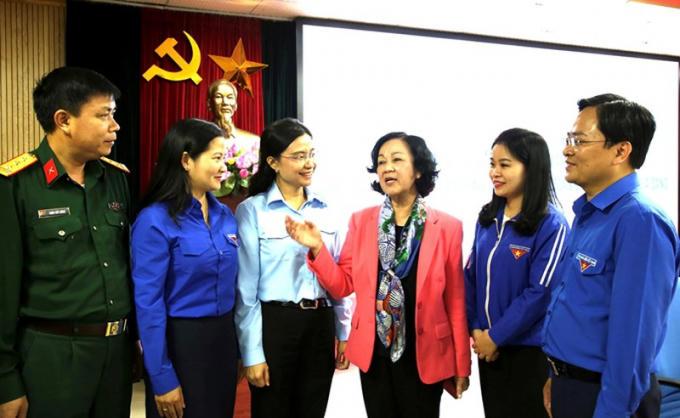 Đồng chí Trương Thị Mai, Ủy viên Bộ Chính trị, Bí thư Trung ương Đảng, Trưởng ban Dân vận Trung ương trao đổi với các cán bộ đoàn chủ chốt, thanh niên tiêu biểu tại Hội nghị góp ý dự thảo các văn kiện Đại hội Đảng do Trung ương Đoàn tổ chức - Ảnh: PC