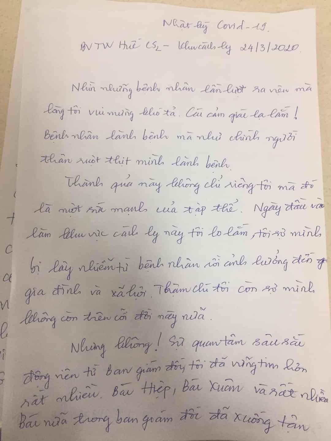 Sự gần gũi, quan tâm của các Bác đã như một động lực, như một ngọn lửa bùng cháy trong tim của tất cả chúng tôi. Chúng tôi cảm thấy tự hào khi là thành viên của đội chống dịch Covid-19. Anh chị em ai cũng động viên nhau để hoàn thàn nhiệm vụ được giao, để khỏi phụ công lao của Ban giám đốc, của Điều dưỡng trưởng bệnh viện đã tin tưởng chúng tôi, giao cho chúng tôi trọng trách quan trọng của lịch sử.