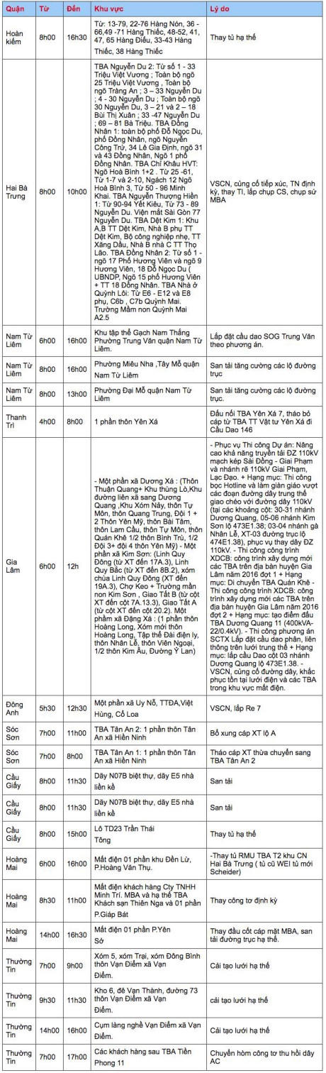 Lịch cắt điện ngày 3/6 được thông báo trên websíte của Tổng công ty điện lực Hà Nội.