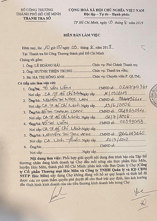 Biên bản làm việc của các tiểu thương với Thanh tra Sở Công Thương TP.HCM ngày 05/8/2019.
