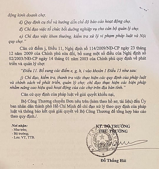 Ngày 26/12/2019, Thứ trưởng Bộ Công Thương Đỗ Thắng Hải đã ký văn bản số 9976/BCT-TTB gửi UBND TP.HCM về việc xử lý đơn của công dân. Nội dung văn bản nêu rõ: