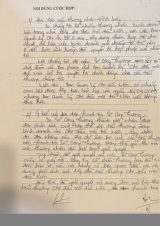 - Các tiểu thương đã nhiều lần gửi đơn đến Công ty TNHH Quản lý và Kinh doanh Chợ đầu mối Nông sản thực phẩm Hóc Môn, Sở Công Thương và các cơ quan nhà nước tại địa phương nhưng chưa được giải quyết;