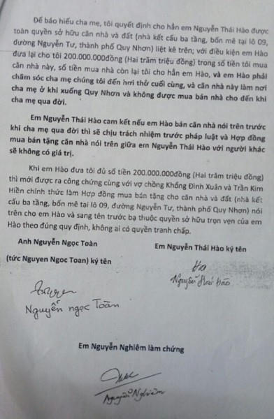 Vì vậy, để báo hiếu cha mẹ, ông Toàn quyết định cho hẳn ông Hào được toàn quyền sở hữu nhà và đất tại lô số 09, đường Nguyễn Tư, phường Lý Thường Kiệt, TP.Quy Nhơn, tỉnh Bình Định với điều kiện là ông Hào đưa lại cho ông Toàn 200 triệu đồng và phải chăm sóc cha mẹ đến hơi thở cuối cùng, không được mua bán nhà cho đến khi cha mẹ qua đời.