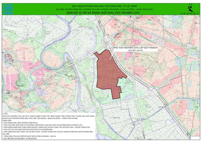Phía Đông Bắc giáp đường vành đai 4; phía Tây Bắc giáp khu vực dân cư của phường Yên Nghĩa, khu đất dịch vụ phường Đồng Mai và quốc lộ 6; phía Đông Nam giáp cụm công nghiệp Thanh Oai và xã Bích Hòa, huyện Thanh Oai; phía Tây và Tây Nam giáp khu đất dịch vụ phường Đồng Mai; phía Nam giáp xã Bích Hòa, huyện Thanh Oai. Tổng diện tích khu đất lập quy hoạch khoảng 226ha, dân số khoảng 19.500 người.