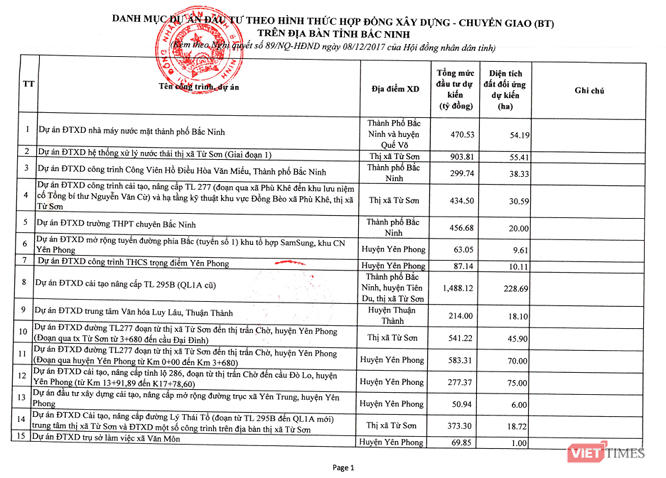 Danh mục dự án đính kèm cho thấy mức độ đa dạng về hình thức, quy mô cũng như địa phương triển khai các công trình, dự án BT tại Bắc Ninh.