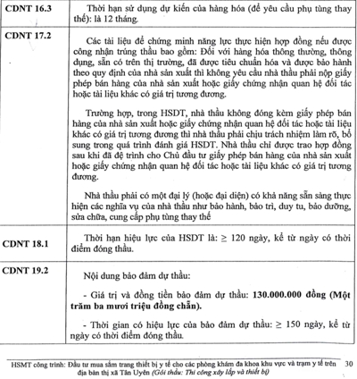 Gói thầu “Đầu tư mua sắm trang thiết bị Y tế cho các Phòng khám đa khoa khu vực và Trạm Y tế trên địa bàn thị xã Tân Uyên” không quy định yêu cầu Giấy phép bán hàng của nhà sản xuất tại CDNT 17.2, điều này là vi phạm quy định của Pháp luật đấu thầu, vi phạm Thông tư 05 Khoản 2 Điều 6 Thông tư 05 quy định rất rõ là đối với các thiết bị kỹ thuật cao, trị giá lớn thì phải yêu cầu Giấy phép bán hàng để gắn nhà sản xuất vào việc cung cấp hàng, bảo hành, bảo trì, cung cấp phụ tùng thay thế sau này: Trong hồ sơ mời thầu trang 30 phần CDNT16.3 có yêu cầu cung cấp phụ tùng thay thế là 12 tháng do vậy yêu cầu giấy ủy quyền của nhà sản xuất là cần thiết.