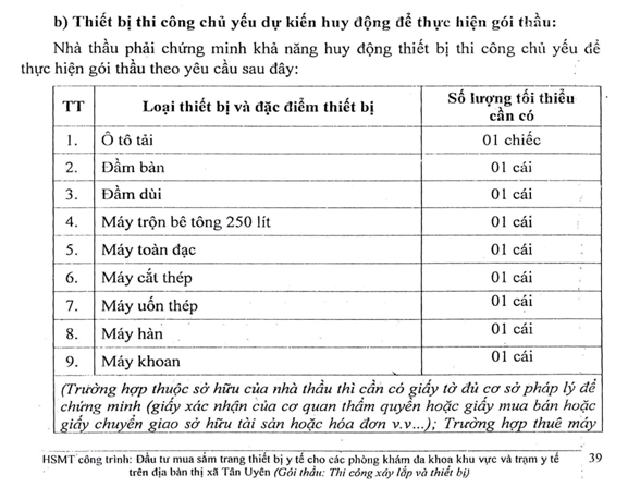 Hồ sơ mời thầu chủ yếu là cung cấp thiết bị y tế thế nhưng trong hồ sơ mời thầu lại yêu cầu Hồ sơ cung cấp thiết bị mà thiết bị thi công chủ yếu dự kiến huy động (trang 39 hồ sơ mời thầu) để thực hiện gói thầu: ô tô tải, đầm bàn, đầm dùi, máy trộn bê tông, máy toàn đạc, máy cắt thép, máy uốn thép, máy hàn, máy khoan điều này vi phạm khoản 5c điều 3 thông tư 05 “Chủ đầu tư không được đưa ra các điều kiện nhằm hạn chế sự tham gia của nhà thầu”.