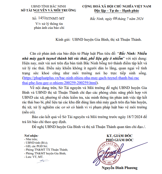 Sau khi Báo Pháp luật Việt Nam đăng tải bài viết “Bắc Ninh: Nhiều nhà máy gạch tuynel thành bãi rác thải, phế liệu gây ô nhiễm” phản ánh về việc tập kết và xử lý rác thải của nhà máy gạch tuynel Công ty Cổ phần Cao Đức (huyện Gia Bình) và nhà máy gạch của Công ty SX&TMDV Ngũ Minh Hưng (thị xã Thuận Thành), ngày 8/7/2024, ông Nguyễn Văn Sơn, Phó phòng Môi trường, Sở TNMT tỉnh Bắc Ninh đã thông tin với phóng viên về vụ việc.