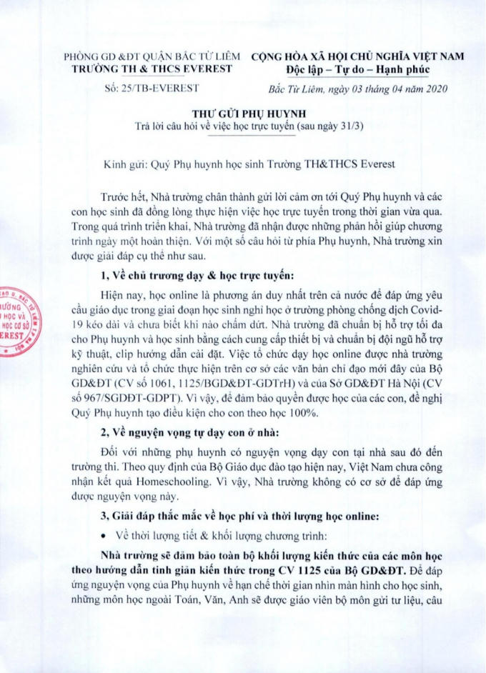 Trao đổi với PV báo Pháp luật Việt Nam, một số phụ huynh có con đang học tại Trường tiểu học Everest cho biết: “Đúng là thời điểm dịch Covid-19 bùng phát, tất cả các tổ chức, cá nhân đều gặp khó khăn, Trường Everest cũng không ngoại lệ. Tuy nhiên, nếu lên phương án thu học phí của các con học qua online cũng phải được bàn bạc, trao đổi với các phụ huynh, khi tất cả các bên thống nhất một mức học phí thì khi đó mới tổ chức thu, chứ không thể áp đặt như hiện nay được”.