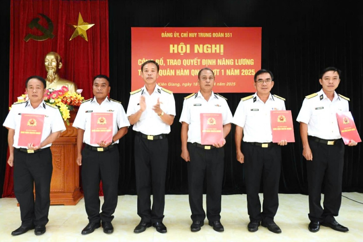 Ngày 18 và 19/4, tại TP Phú Quốc, tỉnh Kiên Giang, Trung đoàn 551 và Lữ đoàn 127 (Bộ Tư lệnh Vùng 5 Hải quân) đã tổ chức công bố, trao quyết định nâng lương, thăng quân hàm quân nhân chuyên nghiệp đợt 1 năm 2025.
