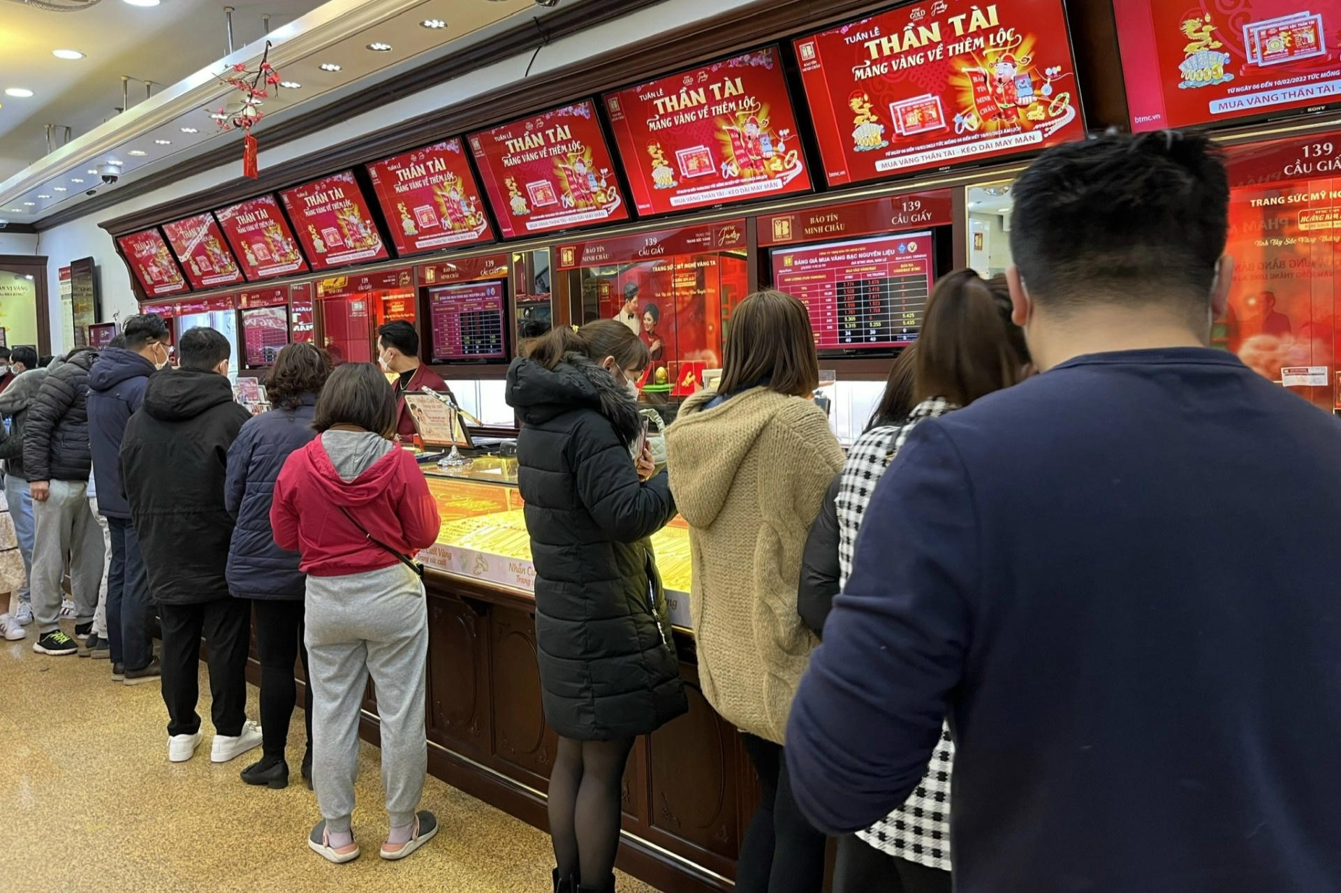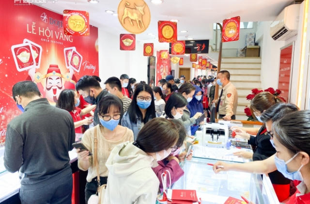Theo khảo sát của Dân trí, chiều 6/2, nhiều tiệm vàng ở Hà Nội chật kín khách đến mua vàng. Trong đó, một số tiệm thông báo đã hết sạch một số mặt hàng vàng và hẹn khách quay lại vào ngày vía Thần tài. Thông thường, các năm trước, giá vàng vào ngày vía Thần tài thường được neo ở mức khá cao.