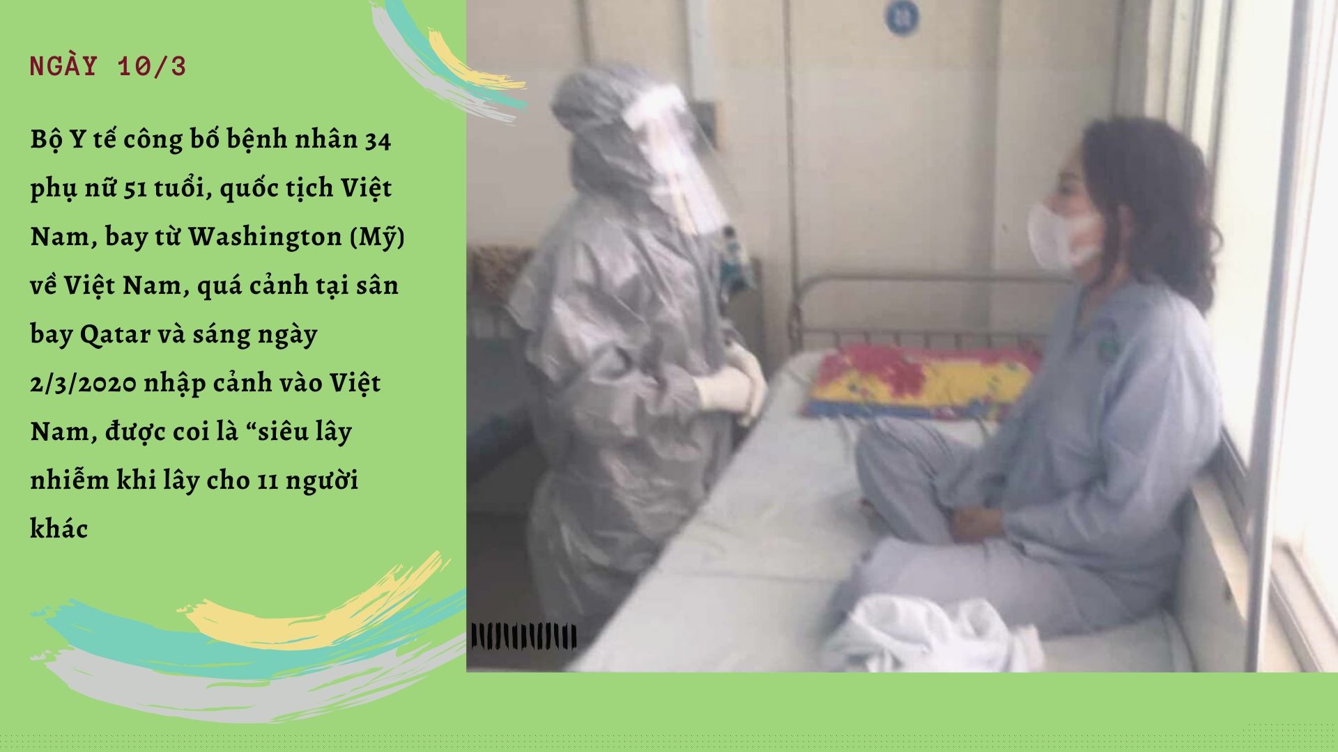 Ngày 10/3, Bộ Y tế công bố bệnh nhân số 34, phụ nữ 51 tuổi, quốc tịch Việt Nam, bay từ Washington (Mỹ) về Việt Nam, quá cảnh tại sân bay Qatar và sáng 2/3/2020 nhập cảnh vào Việt Nam. Bệnh nhân số 34 được coi là “siêu lây nhiễm khi lây cho 11 người khác, trong đó có 5 người là người thân, 3 người tiếp xúc trực tiếp và 3 người khác tiếp xúc F2 của bệnh nhân 34.