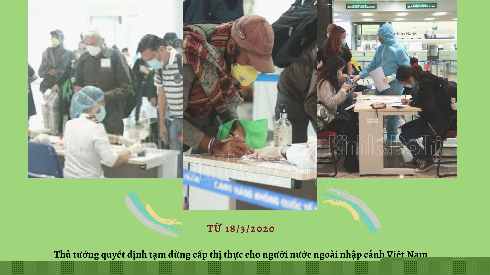 Từ ngày 18/3, Thủ tướng quyết định tạm dừng cấp thị thực cho người nước ngoài nhập cảnh Việt Nam; hạn chế các chuyến bay từ vùng dịch đến Việt Nam; Đại sứ quán Việt Nam tại các nước khuyến cáo học sinh, sinh viên, người Việt Nam ở nước ngoài không về Việt Nam trong thời gian có dịch, trường hợp thật sự cần thiết phải nhập cảnh Việt Nam, phải được cách ly tập trung;