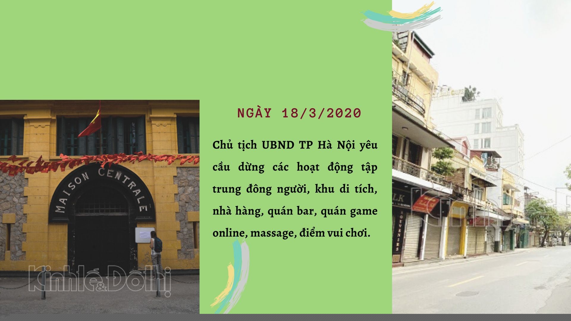 Tại Hà Nội, ngày 18/3, Chủ tịch UBND TP Hà Nội Nguyễn Đức Chung yêu cầu dừng các hoạt động tập trung đông người, khu di tích, nhà hàng, quán bar, quán game online, massage, điểm vui chơi. Hà Nội khuyến cáo những cửa hàng không thiết yếu hạn chế hoạt động; người dân nếu không có việc cần thiết, không nên ra đường nhiều. Đặc biệt, Hà Nội đang có khoảng 1,4 triệu người từ 60 tuổi trở nên cần tránh quá trình đi lại.