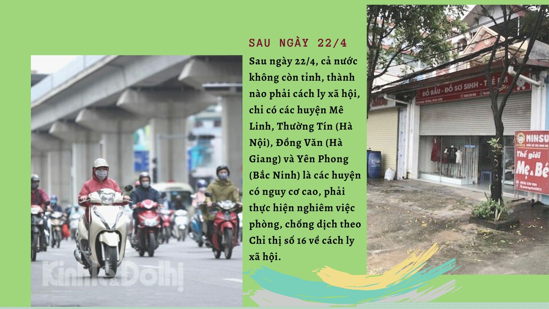 Sau ngày 22/4, cả nước không còn tỉnh, thành nào phải cách ly xã hội, chỉ có 4 huyện hồm: các huyện Mê Linh, Thường Tín (Hà Nội), Đồng Văn (Hà Giang) và Yên Phong (Bắc Ninh) là các huyện có "nguy cơ cao", phải thực hiện nghiêm việc phòng, chống dịch theo Chỉ thị số 16 về cách ly xã hội.