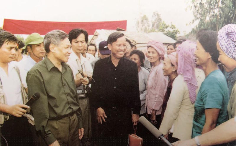 Nguyên Tổng bí thư Lê Khả Phiêu và nguyên Bí thư Tỉnh ủy Đồng Tháp Trương Vĩnh Trọng thăm, động viên bà con nhân dân khắc phục khó khăn, ổn định đời sống sinh hoạt sau cơn lũ đầu năm 2000. - Ảnh tư liệu/TNO