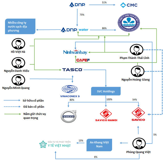 Mặc dù có nhiều mối liên quan đến nhau nhưng sự liên kết giữa các công ty như DNP, Tasco, Savico hay JVC chủ yếu thông qua các cá nhân. Điển hình như tân Chủ tịch Tasco Hồ Việt Hà là Phó Chủ tịch DNP Water, ngoài ra còn là Chủ tịch của Ninh Vân Bay (NVT). Một lãnh đạo của nhiều công ty trong mảng nước của DNP là ông Nguyễn Danh Hiếu cũng tham gia vào HĐQT của Tasco.