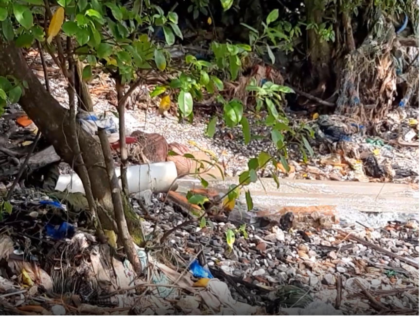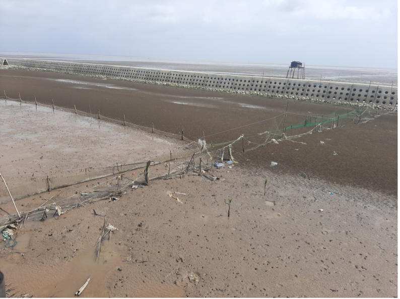 Đây là những tấm lưới phục vụ mô hình đánh bắt nghêu biển tại địa phương. Tuy nhiên, khi được phỏng vấn, một nhân viên thuộc quán ăn nhà sàn khẳng định, các tấm lưới này có mục đích chắn rác, đảm bảo dù rác dù có rơi xuống cũng không thể trôi xa.