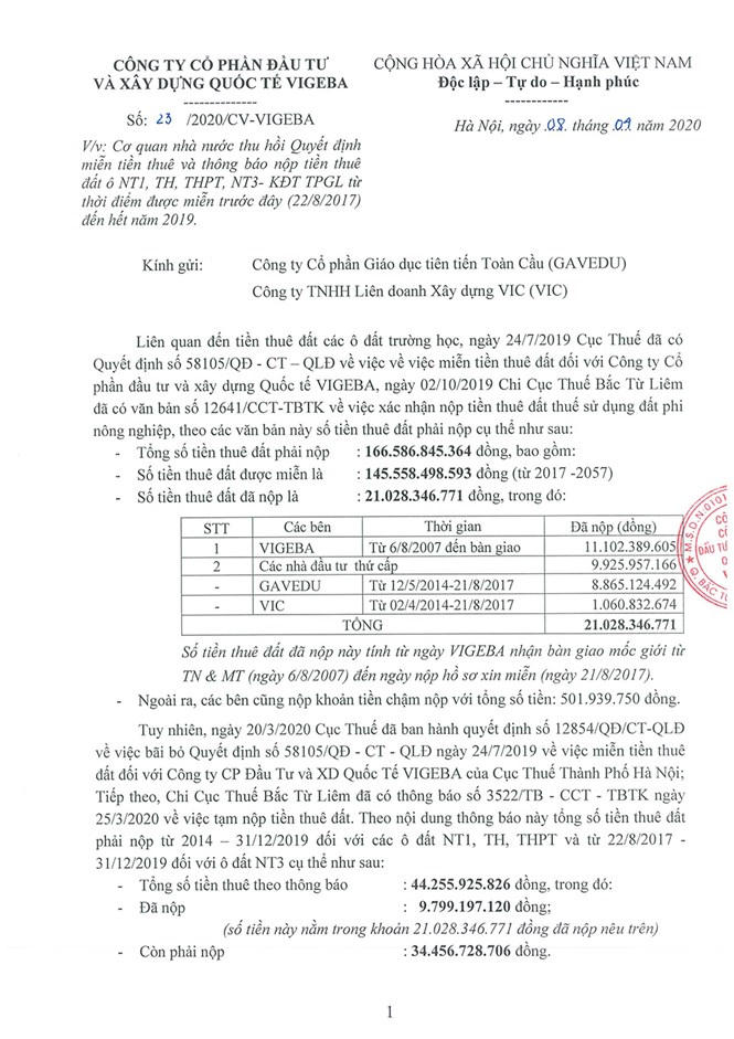 Trên cơ sở của các văn bản của cơ quan Thuế, ông Phạm Hồng Sơn - Tổng Giám đốc Công ty VIGEBA đã có văn bản số 23/2020/CV-VIGEBA gửi các nhà đầu tư thứ cấp, trong đó có Công ty Cổ phần Giáo dục Tiên tiến Toàn Cầu.