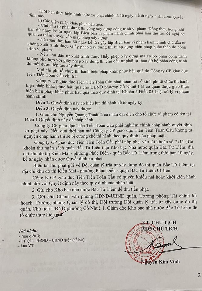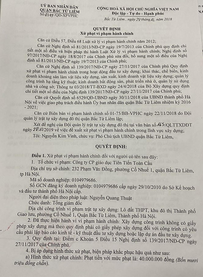 Quyết định xử phạt vi phạm hành chính của UBND quận Bắc Từ Liêm đối với hành vi vi phạm của Công ty Cổ phần Giáo dục Tiên tiến Toàn Cầu do ông Nguyễn Quang Thuật - Tổng Giám đốc, là người đại diện pháp luật.