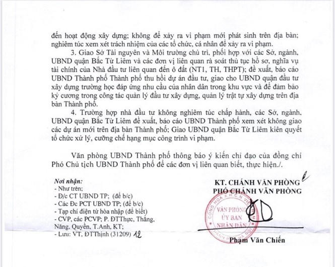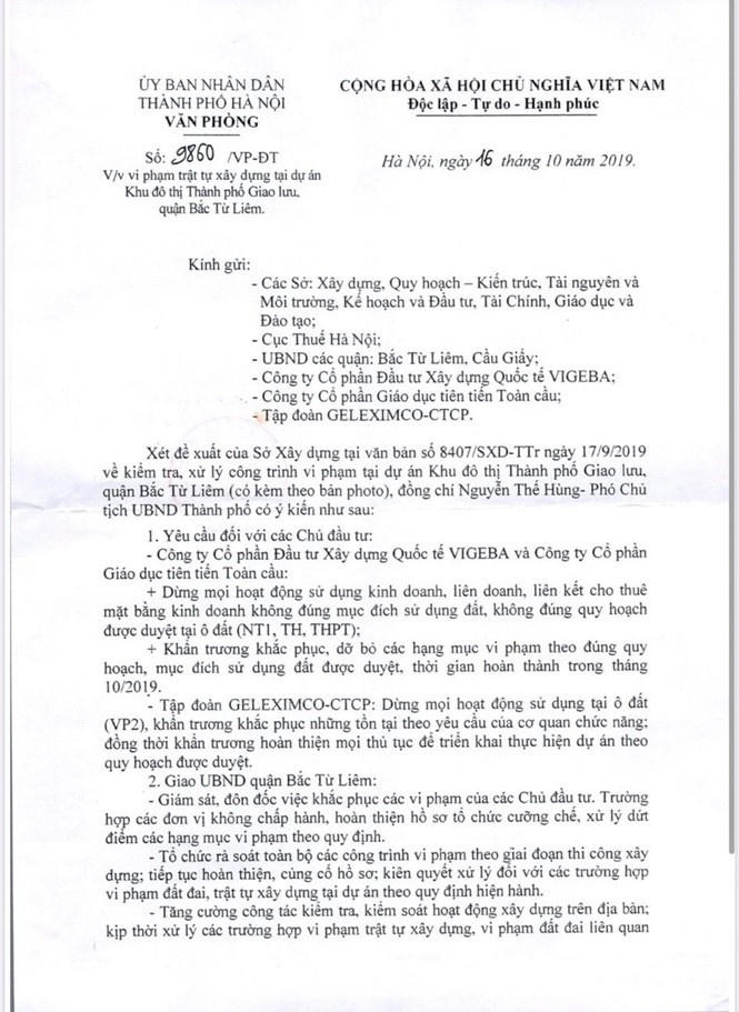 Các sai phạm về đất đai, quy hoạch tại các ô đất dự án do Công ty Cổ phần Giáo dục Tiên tiến Toàn Cầu làm chủ đầu tư chỉ được xử quyết liệt khi Văn phòng UBND Thành phố Hà Nội có văn bản số 9860/VP-ĐT ngày 16/10/2019 truyền đạt ý kiến của ông Nguyễn Thế Hùng - Phó Chủ tịch UBND thành phố Hà Nội gửi các Sở: Xây dựng, Quy hoạch - Kiến trúc, Tài nguyên và Môi trường, Kế hoạch và Đầu tư, Tài chính, Giáo dục; Cục Thuế Hà Nội; UBND các quận Bắc Từ Liêm, Cầu Giấy; Công ty Cổ phần Đầu tư Xây dựng Quốc tế VIGEBA; Công Cổ phần Giáo dục Tiên tiến Toàn cầu; Tập đoàn GELEXIMCO-CTCP.