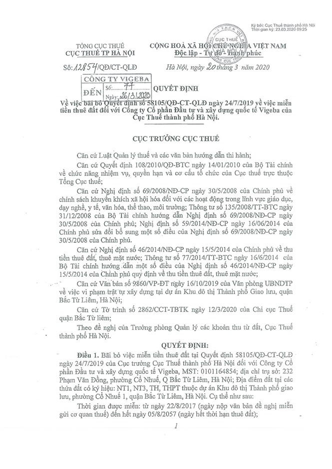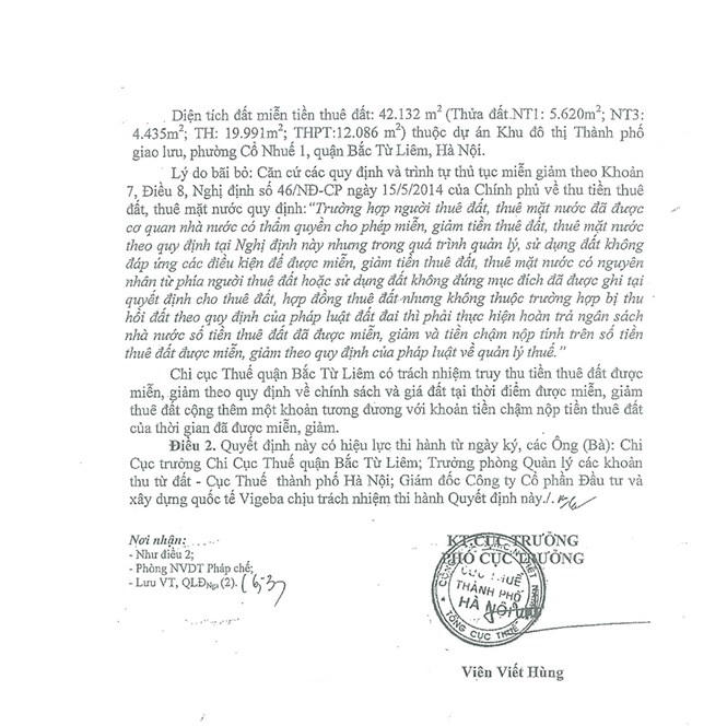 Đối với hành vi sử dụng đất sai mục đích, sai quy hoạch của các chủ đầu tư tại Khu đô thị Thành phố Giao Lưu, mới đây, Cục trưởng Cục Thuế Hà Nội đã có Quyết định số 18854/QĐ/CT-QLĐ ngày 25/3/2020 về việc bãi bỏ Quyết định số 58105/QĐ-CT-QLĐ ngày 24/7/2019 về việc miễn tiền thuê đất đối với Công ty Cổ phần Đầu tư và Xây dựng Quốc tế VIGEBA của Cục Thuế thành phố Hà Nội.