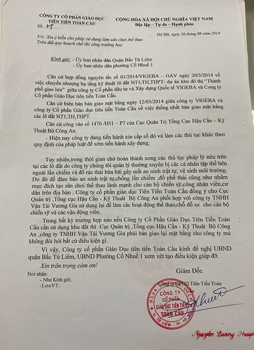 Để biện minh cho hành vi “hô biến” hàng chục nghìn mét vuông đất xây dựng trường học thành các điểm kinh doanh dịch vụ trục lợi, bất chấp pháp luật, trong văn bản gửi các cấp của quận Bắc Từ Liêm ngày 20/8/2018, ông Nguyễn Quang Thuật - Giám đốc Công ty Cổ phần Giáo dục Tiên tiến Toàn Cầu đã lấy lý do, trong thời gian chờ hoàn thành xong các thủ tục pháp lý, các ô đất thường xuyên bị các cá nhân tập thể bên ngoài lấn chiếm và đổ rác bừa bãi gây mất an ninh trật tự, vệ sinh môi trường. Do đó, để đảm bảo an ninh trật tự, chống lấn chiếm, đổ phế thải cũng như nhằm mục đích tạo sân chơi thể thao lành mạnh cho cán bộ chiến sỹ, công an viên, cư dân địa bàn. Công ty Cổ phần Giáo dục Tiên tiến Toàn Cầu đồng ý cho Cục Quản trị, Tổng cục Hậu cần - Kỹ thuật (Bộ Công an) phối hợp với Công ty TNHH Vận tải Vương Gia sử dụng lại để làm các hoạt động thể thao, chỗ đỗ xe cho cán bộ chiến sỹ và các vận động viên.