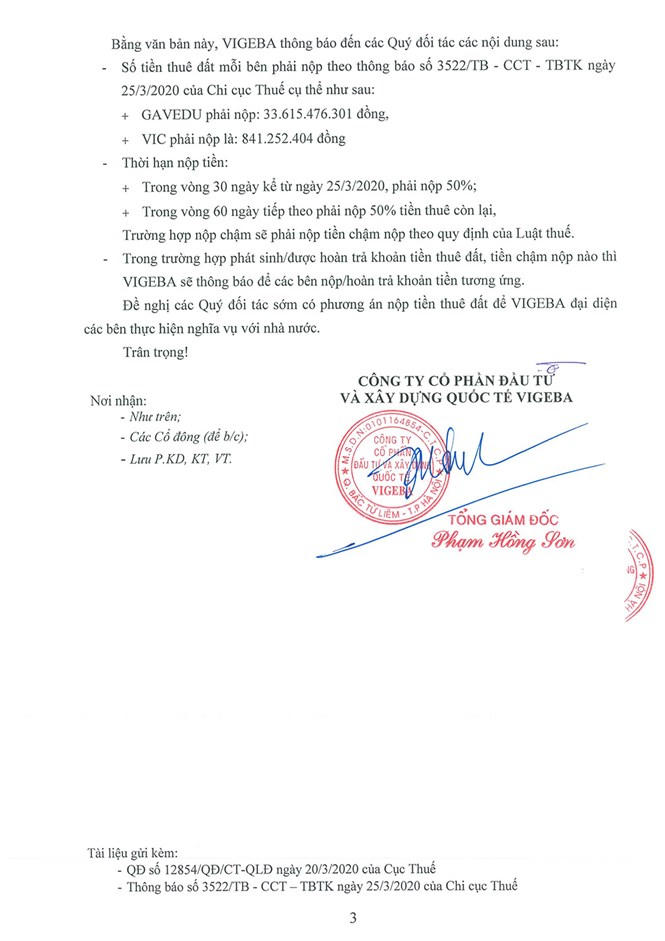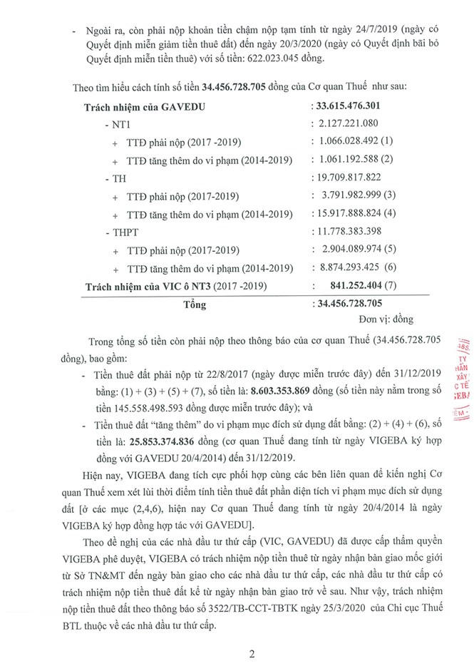 Trên cơ sở của các văn bản của cơ quan Thuế, ông Phạm Hồng Sơn - Tổng Giám đốc Công ty VIGEBA đã có văn bản số 23/2020/CV-VIGEBA gửi các nhà đầu tư thứ cấp, trong đó có Công ty Cổ phần Giáo dục Tiên tiến Toàn Cầu.