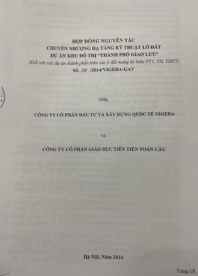 Bản Hợp đồng nguyên tắc số 01/2014/VIGEBA-GAV về việc chuyển nhượng hạ tầng kỹ thuật ô đất mang ký hiệu NT1, TH, THPT thuộc dự án Khu đô thị Thành phố Giao Lưu giữa Công ty VIGEBA và Công ty Cổ phần Giáo dục Tiên tiến Toàn Cầu được ký kết trước khi văn bản chấp thuận chủ trương của Thành phố Hà Nội.