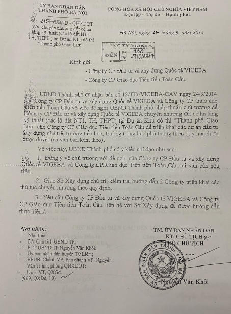 Sau đó, ngày 27/3/2014, Phó Chủ tịch UBND thành phố Hà Nội Nguyễn Văn Khôi đã ký ban hành văn bản số 2157/UBND-QHXDGT đồng ý về chủ trương để Công ty VIGEBA chuyển nhượng đất có hạ tầng kỹ thuật (các lô đất NT1, TH, THPT) tại Dự án Khu đô thị Thành phố Giao lưu cho Công ty GAVEDU để triển khai các dự án đầu tư xây dựng nhà trẻ, trường tiểu học, trường trung học phổ thông theo quy hoạch đã được phê duyệt.