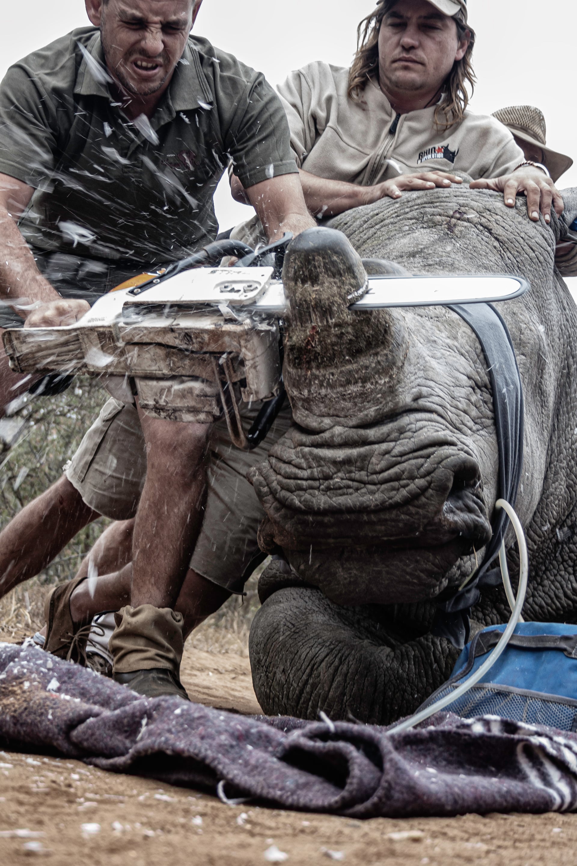 Một con tê giác đang được cưa sừng để tránh bị săn trộm . Các chuyên gia khuyến cáo tê giác nên được cưa sừng mỗi 12-24 tháng với mức độ săn bắt hiện nay.