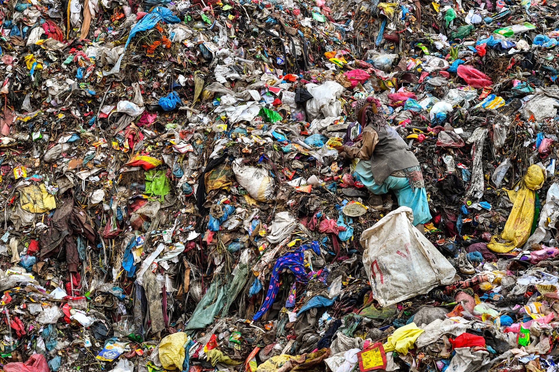 Một phụ nữ ngủ trên bờ sông đầy rác ở Bangladesh.