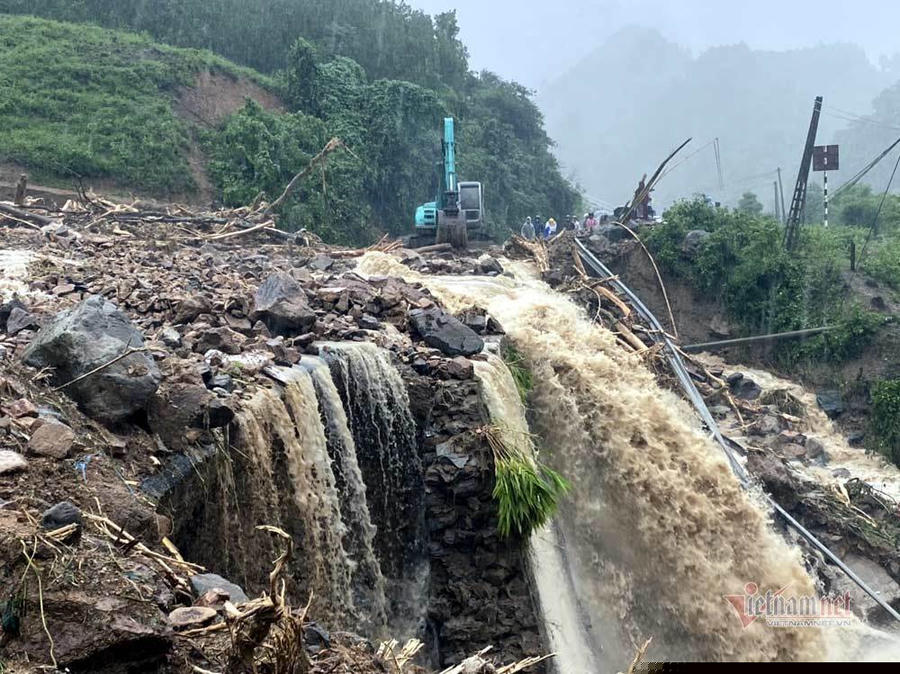 Lũ quét từ thượng nguồn đổ về làm sạt lở nghiêm trọng tuyến quốc lộ 49 nối TP Đông Hà với huyện miền núi Hướng Hóa, Quảng Trị. Ảnh: Đình Thành