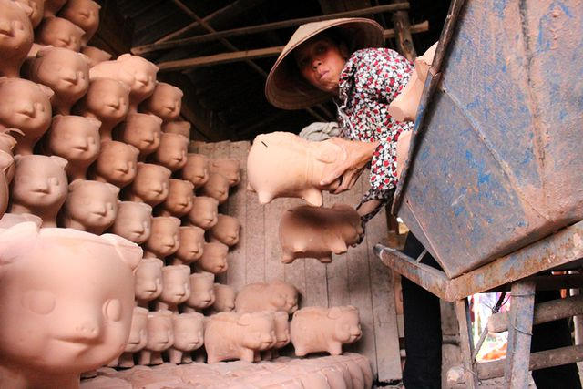 Về “công nghệ” làm heo đất, anh Nguyễn Văn Châu (thợ làm gốm ở xã Tân Vĩnh Hiệp, thị xã Tân Uyên) kể: “Sau khi đổ đất sét vào khuôn, chỉ cần chờ trong 1-2 tiếng, người thợ có thể thu gom sản phẩm để đưa vào lò nung. Làm nghề này cực lắm, mỗi con heo, gà đất thành phẩm được chủ lò trả công chưa đến 1.000 đồng. Mỗi ngày tôi có thể làm được khoảng 200 sản phẩm”.