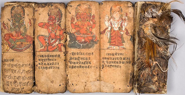 Cuốn sách dành cho các pháp sư ở Nepal có niên đại từ thế kỷ 18. Cuốn sách này có chứa máu, da và thịt của 5 loài động vật tượng trưng cho 5 giác quan, gồm bò, gà, chó, dê và trâu.